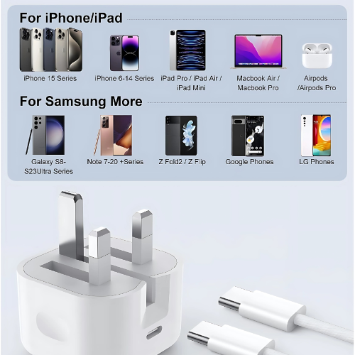 The Apple 25W PD Fast Charger provides rapid, efficient charging for your iPhone, iPad, and other compatible Apple devices. Featuring Power Delivery (PD) technology, this charger ensures fast, reliable, and safe power delivery, reducing charging time significantly. The 3-pin UK adapter design ensures compatibility with UK outlets, making it perfect for travel or home use. Its compact and lightweight build makes it easy to carry, offering convenience without compromising performance.